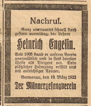 Am 31.Dezember 1933 wird dieser Gau durch den Führer des deutschen Sängerbundes Herrn Brauer aus Berlin aufgelöst. Am 26.Januar 1936 beschloss die ausserordentliche Generalversammlung die Trennung der Germenauer Sänger vom MGV-Jahrstedt.